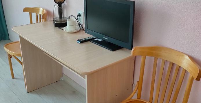 В номерах: широкие кровати, прикроватные тумбочки, стол, стулья, диван, кресло, журнальный столик с чайником , шкаф, телевизор, санузел с душем, Wi-FI.